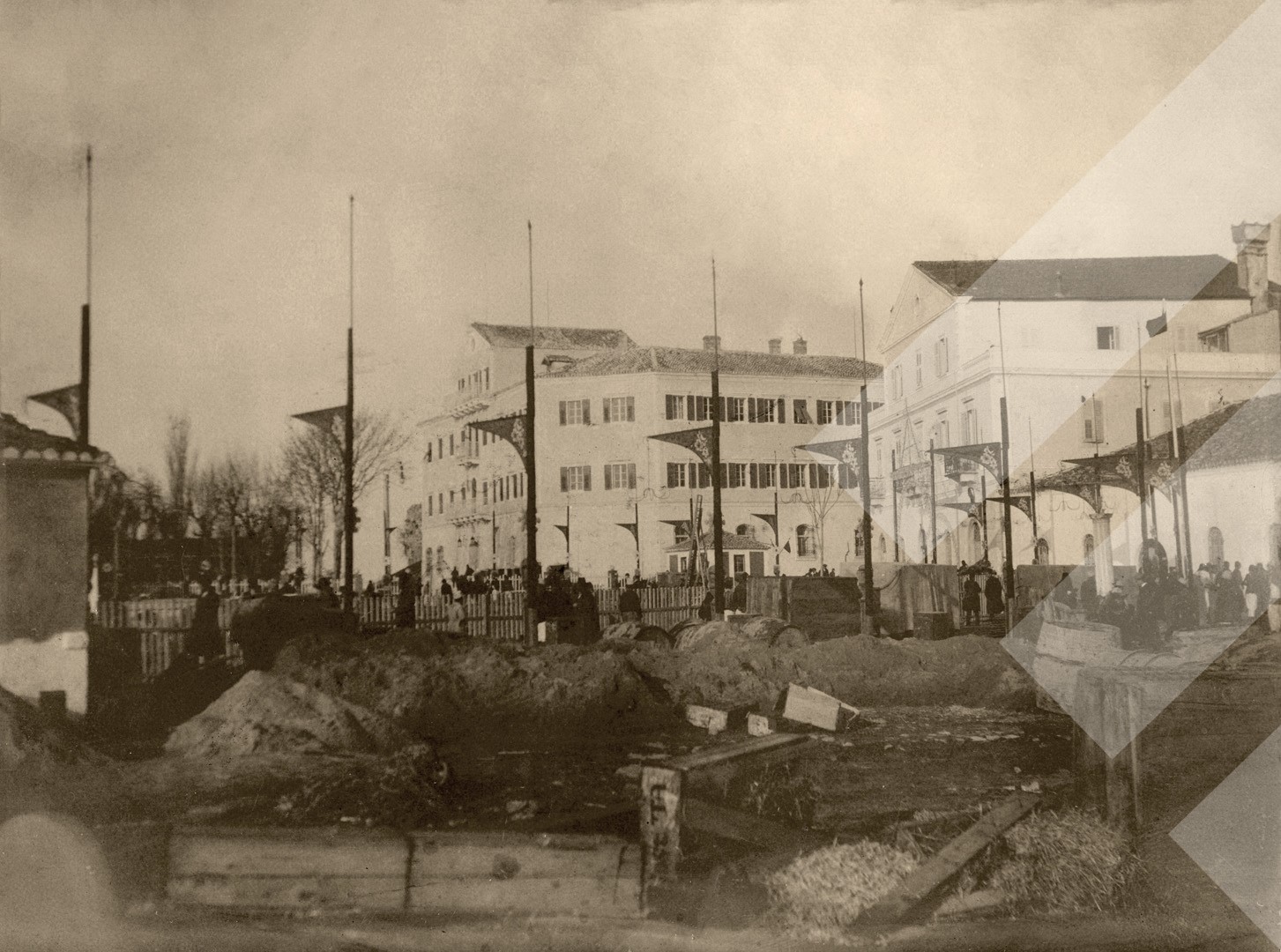 I panjohur 1914, Qyteti i Durrësit i zbukuruar me flamuj dekorativë në pritje të ardhjes së Princit Wilhelm Wied, mbreti i shqiptarëve, print në letër, 12 x 16 cm.