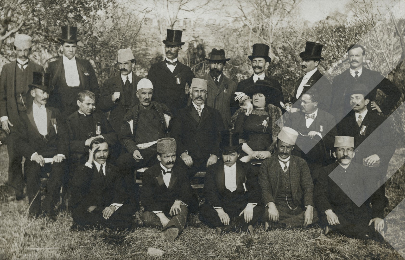I panjohur 1914, Politikanë të huaj dhe Shqiptarë dalë në Durrës më 7 Mars 1914 me rastin e ardhjes të Princ Vilhelm Wied. (Në qendër Isa Boletini dhe Bajram Curri), print në letër, 9 x 14 cm.