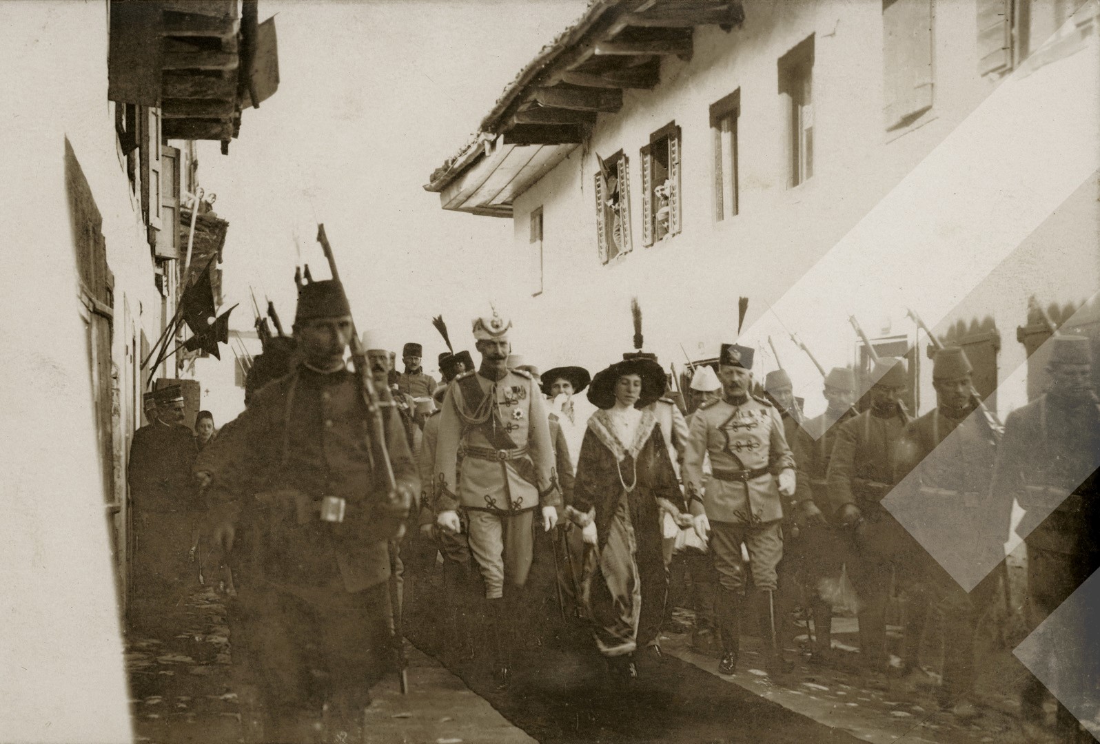 I panjohur 1914, Princi Wilhelm Vid dhe Princesha Sofi, duke kaluar në një rrugë të Durrësit, print në letër, 9 x 14 cm.