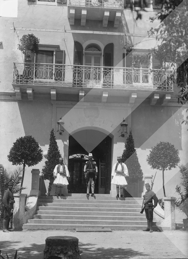 Petro Dhimitri, 1914, Rojet Shqiptare në hyrje të pallatit të Princ Vidit, pllakë xhami, 13 x 18 cm.