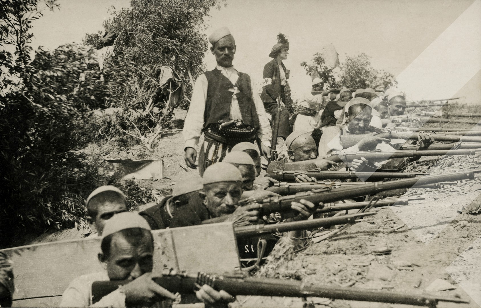 I panjohur, 1918, Malësorët e armatosur të Preng Bib Dodës në mbrojtje të Princ Wilhelm Vid-it, print në letër, 9 x 14 cm.