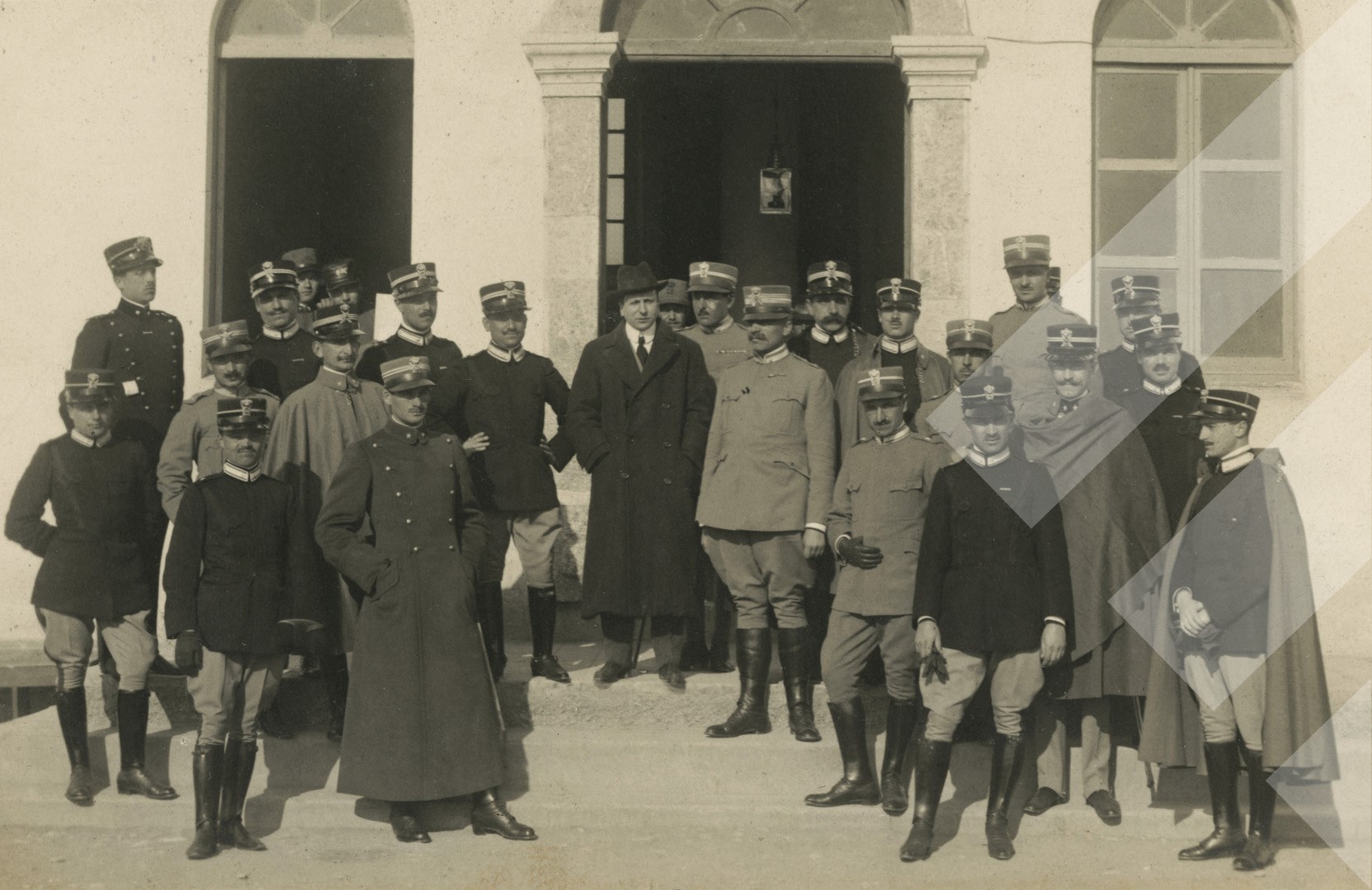 I panjohur 1913, Ushtarakë Italianë para Konsullatës Italiane në Shkodër. (në qëndër konsulli), Print në letër, 9 x 14 cm.
