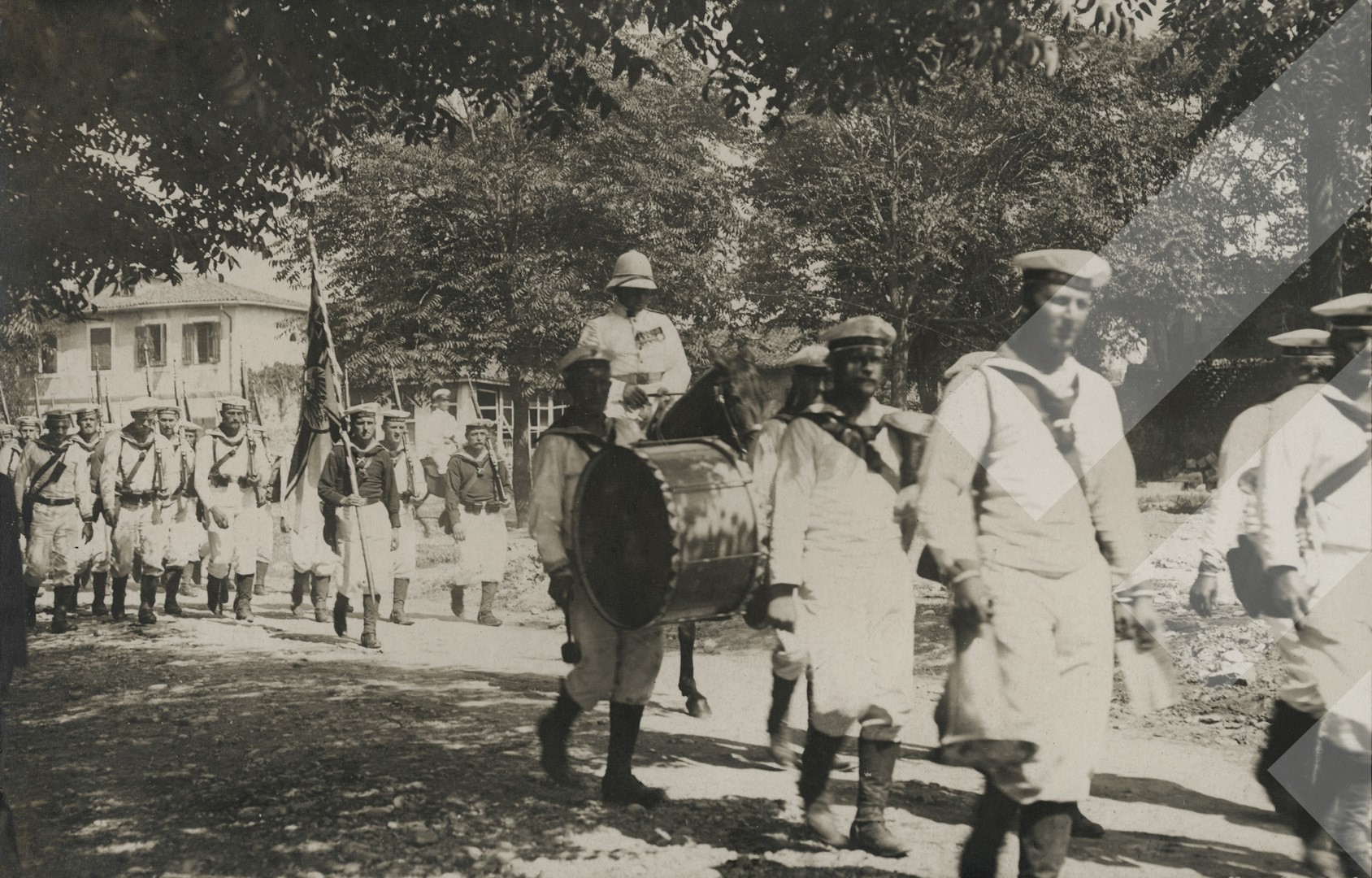 I panjohur 1913, Banda dhe tupa gjermane duke parakaluar në Shkodër, Print në letër, 9 x 14 cm.