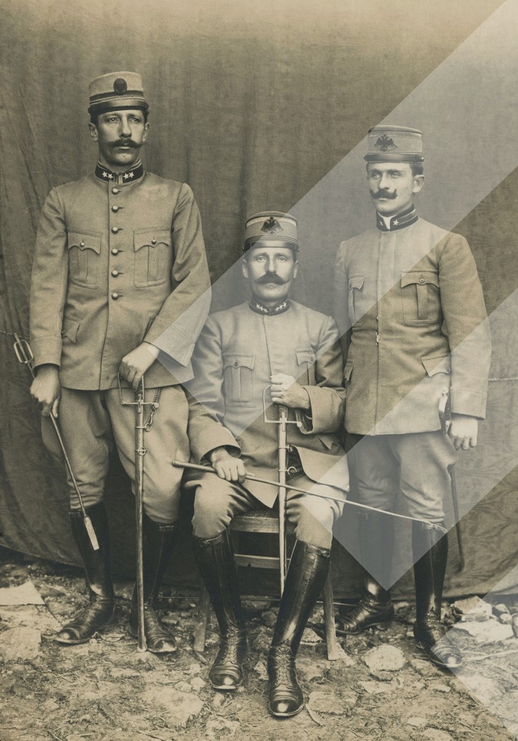 I panjohur 1912, Oficerë shqiptarë me uniformën e re të vitit 1912. Nga e majta Sali Ohri, Rexhep Shala, i paidentifikuar, print në letër, 10 x 15 cm.