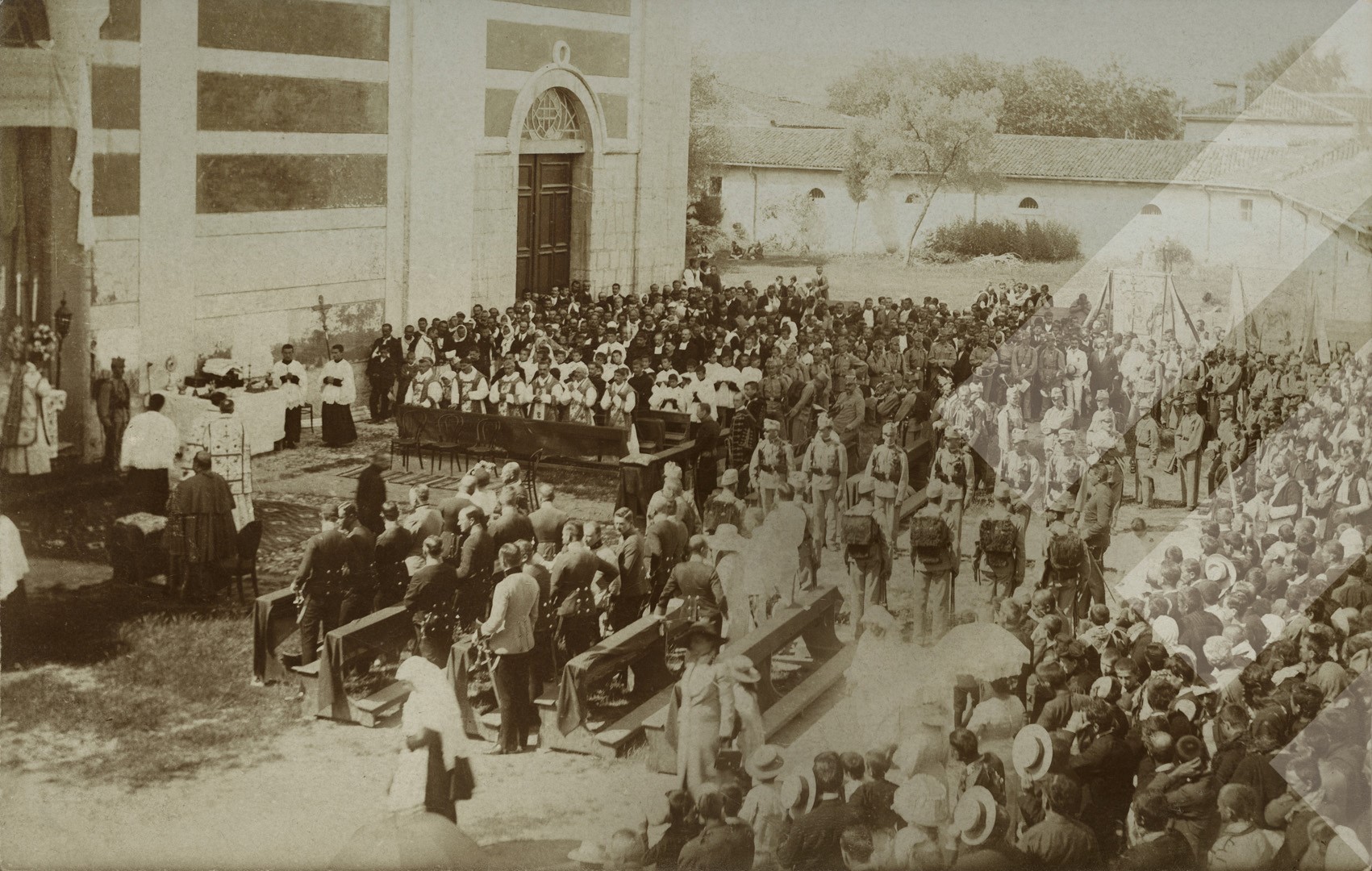 I panjohur 1913, Trupa austro-hungareze gjatë një meshe në Shkodër, print në letër, 9 x 14 cm.