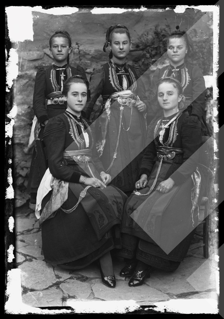Petro Dhimitri, rreth 1920-1925, Grup vajzash me veshje dardhare, pllakë xhami, 9 x 13 cm.