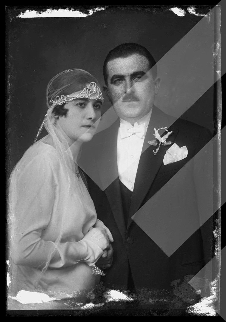 Petro Dhimitri, rreth 1920-1925, Thea, e bija e fotografit, me bashkëshortin, pllakë xhami, 9 x 13 cm.