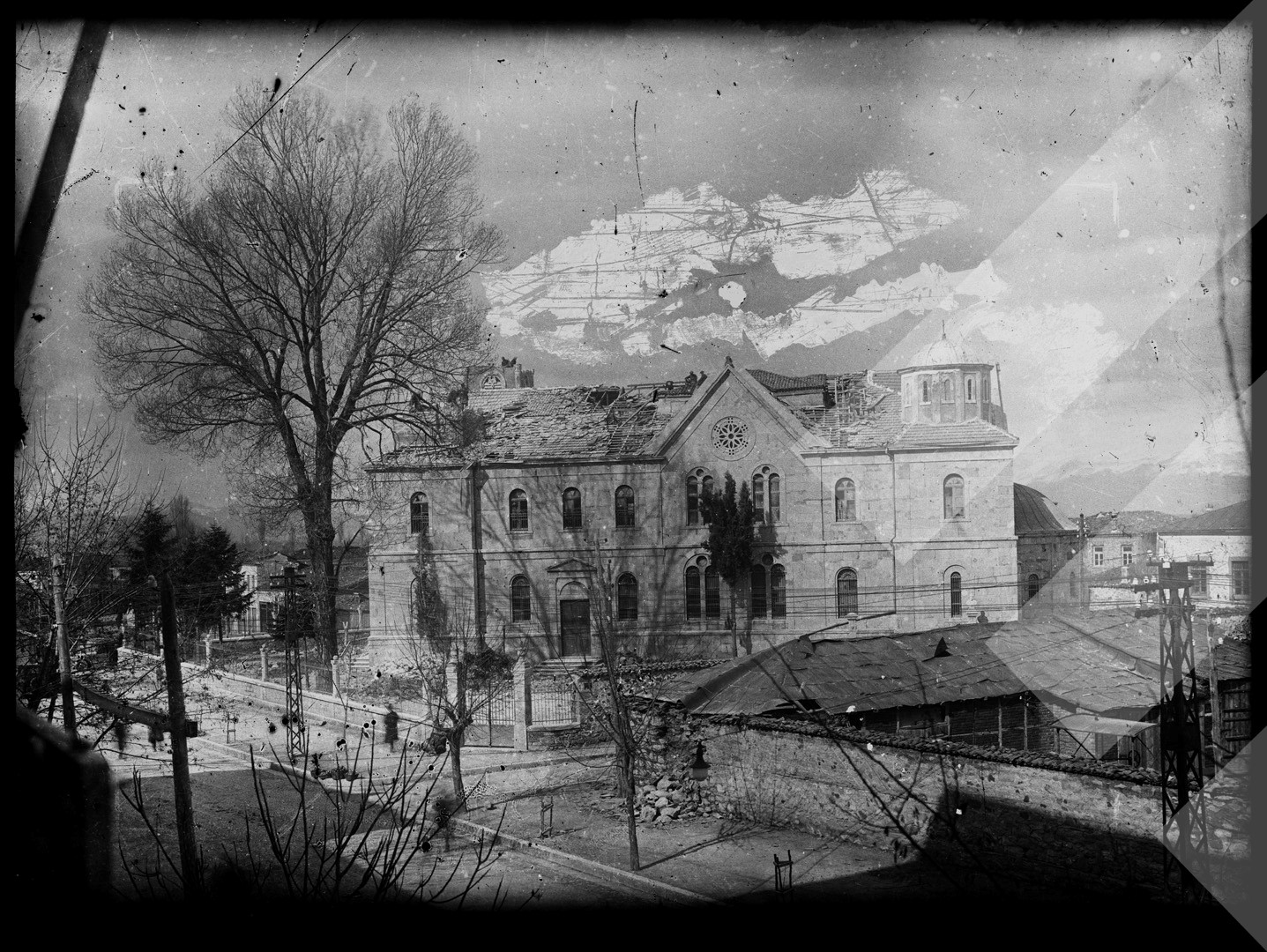 Petro Dhimitri, 1931 Riparime në çatinë e Kishës së Shën Gjergjit dëmtuar pas tërmetit, Korçë, pllakë xhami, 13 x 18 cm.