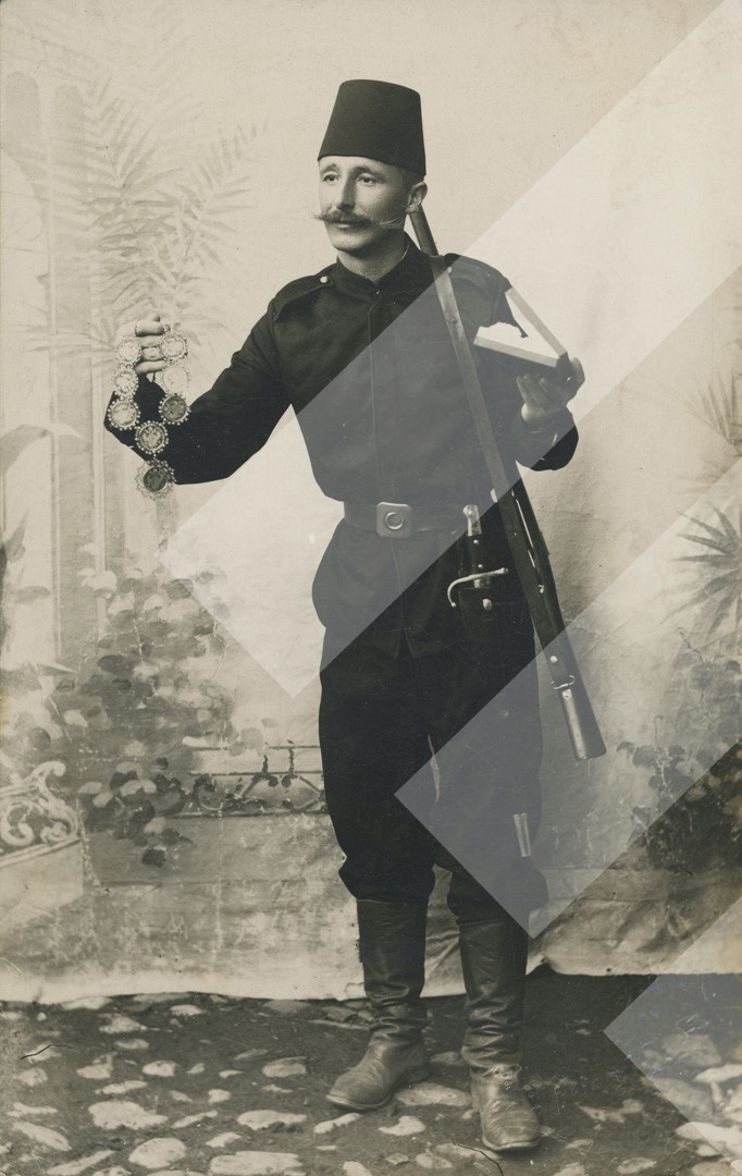 Petro Dhimitri, shkrepur rreth 1900-1910, stampuar më 1929, Refik Bej Toptani me uniformë ushtarake osmane duke mbajtur në dorë një gjerdan me monedha floriri, print në letër, 9 x 14 cm.