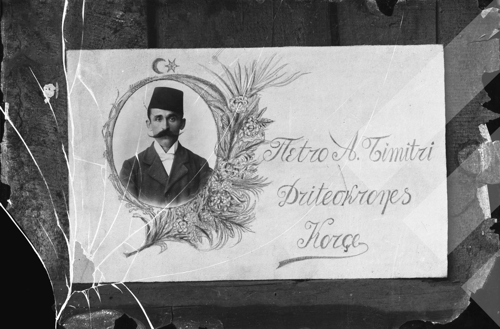 Petro Dhimitri, rreth 1895, Boca e kartvizitës së Petro Dhimitrit, pllakë xhami, 8 x 12 cm.