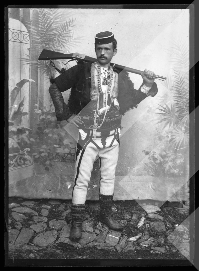Petro Dhimitri, rreth 1908, Lef Nosi në pozë me veshje malësori, pllakë xhami, 12 x 16 cm.
