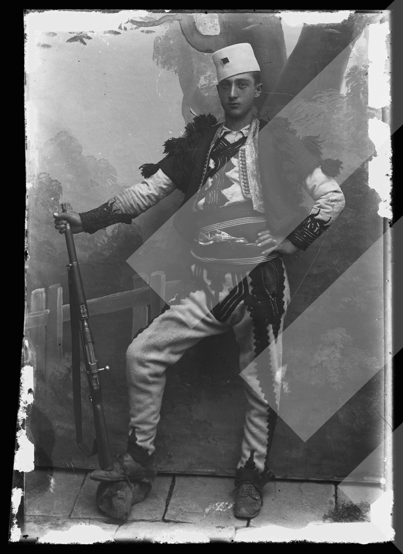 Petro Dhimitri, rreth 1913-1915, Djalosh me veshje tradicionale në pozë me armë, pllakë xhami, 9 x 13 cm.