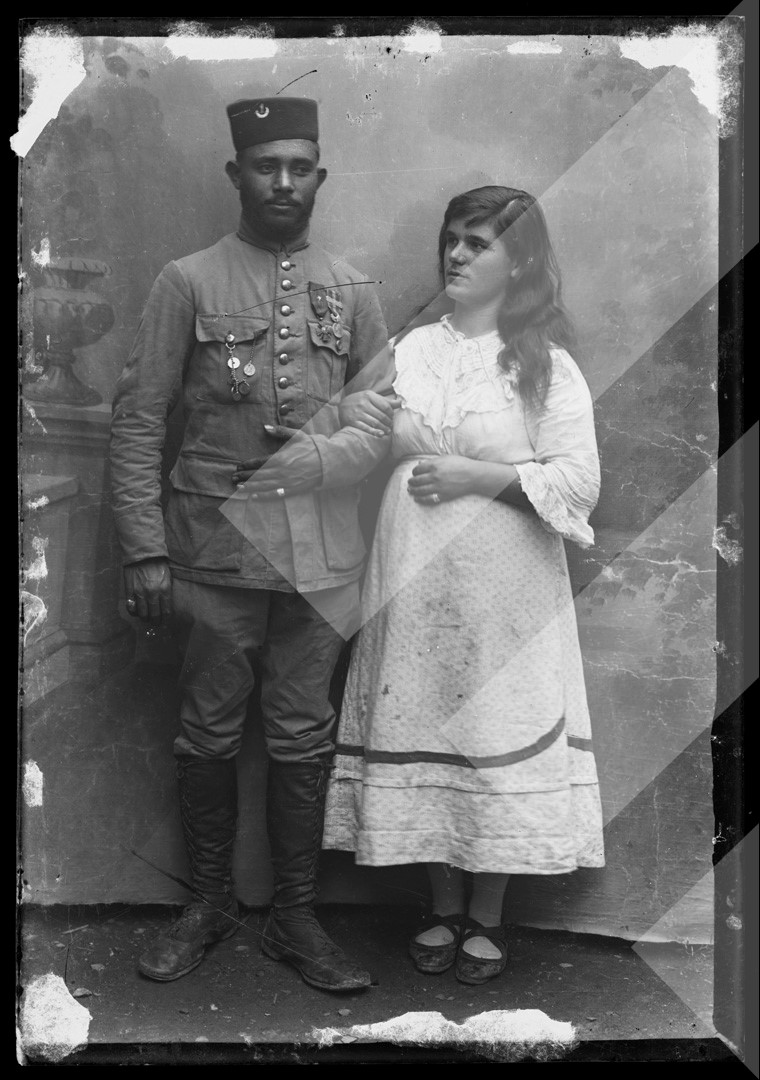 Petro Dhimitri, rreth 1917-1918, Ushtar i Armatës së Orientit me bashkëshorten e tij vendase, pllakë xhami, 9 x 13 cm.