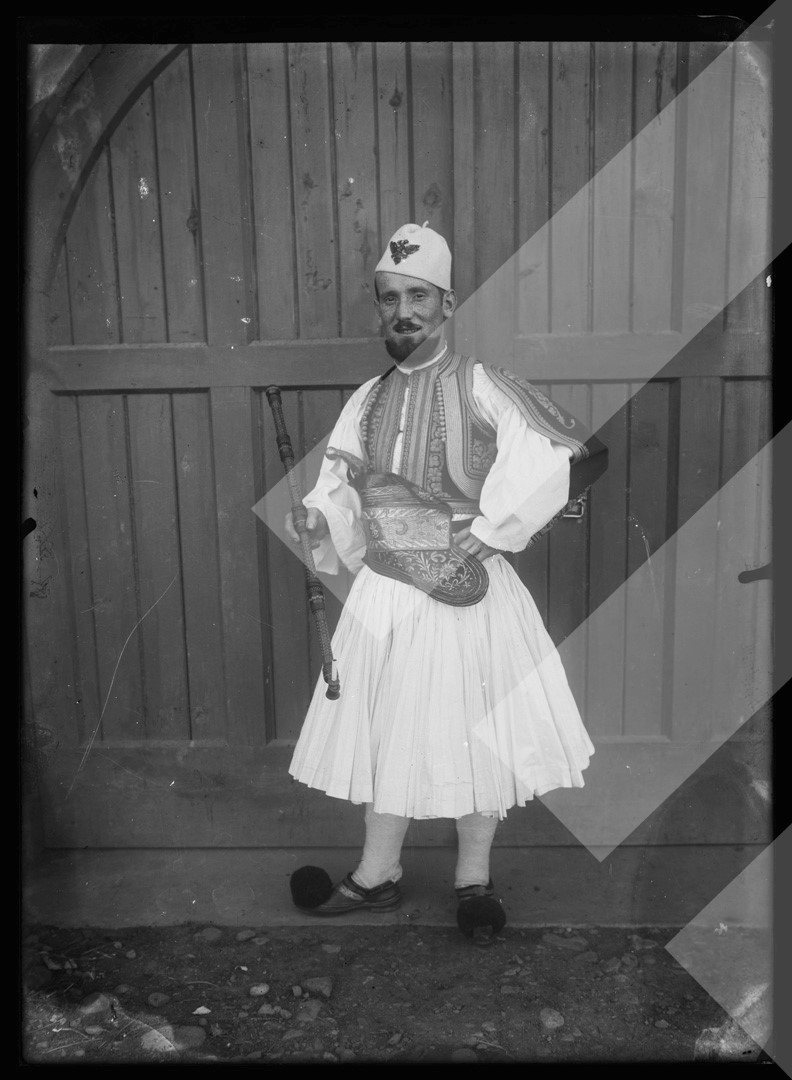 Petro Dhimitri, rreth 1917-1918, Oficer i huaj në pozë me veshje popullore shqiptare, pllakë xhami, 13 x 18 cm.