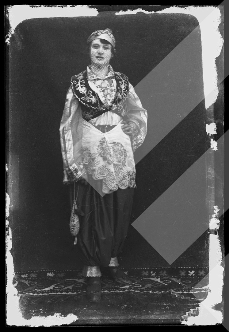 Petro Dhimitri, rreth 1920-1925, Në pozë me veshje popullore, pllakë xhami, 9 x 13 cm.