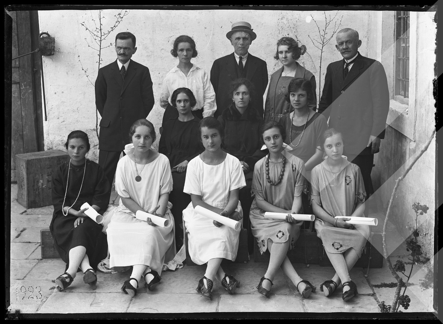 Petro Dhimitri, 1923 Grup vajzash të sapodiplomuara (në qendër Ollga, e bija e fotografit), Korçë pllakë xhami, 13 x 18 cm.