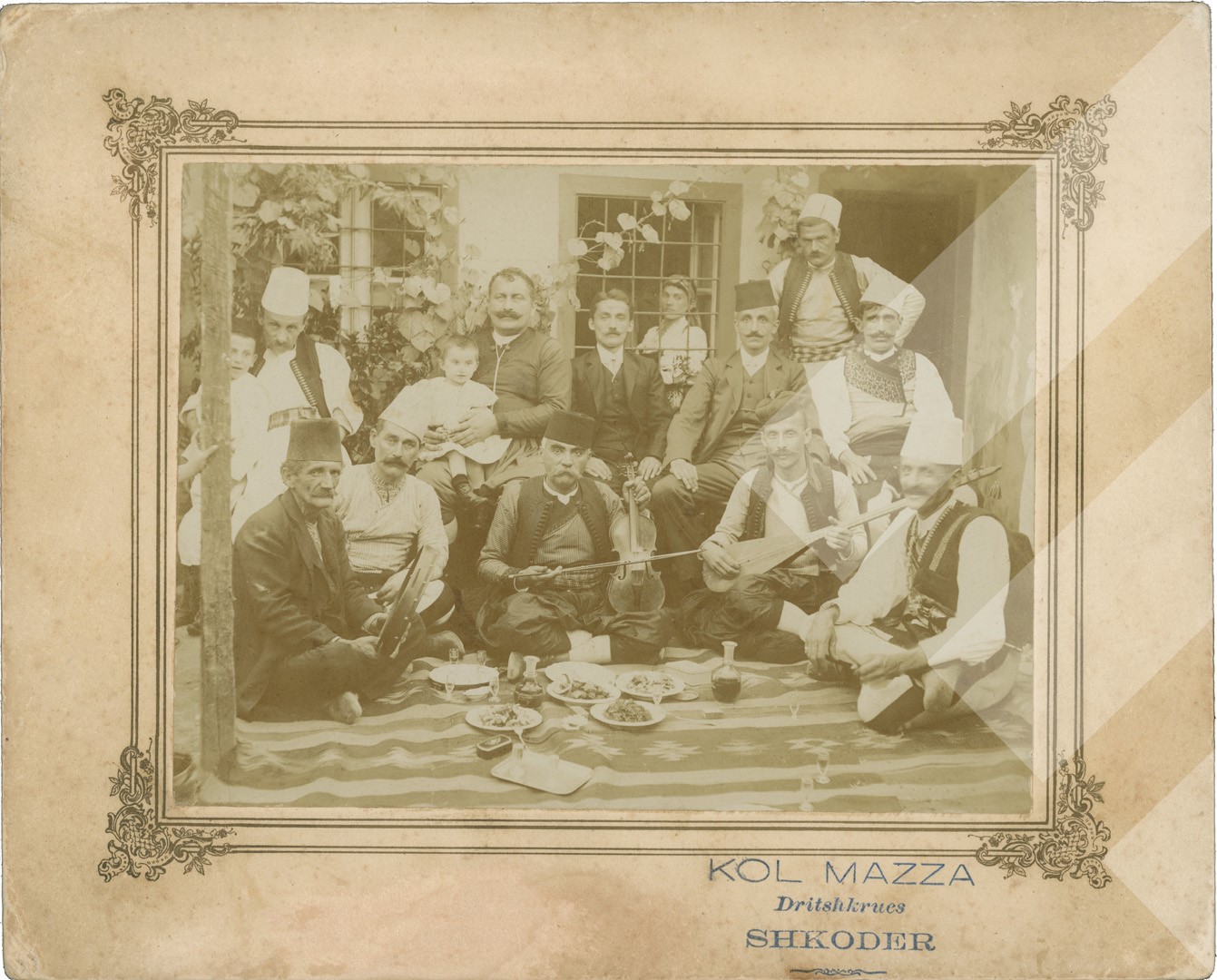 Kol Maca, rreth 1901-1905 Muzikantë shkodranë në oborr, print në letër, 11.5 x 15.5 cm.