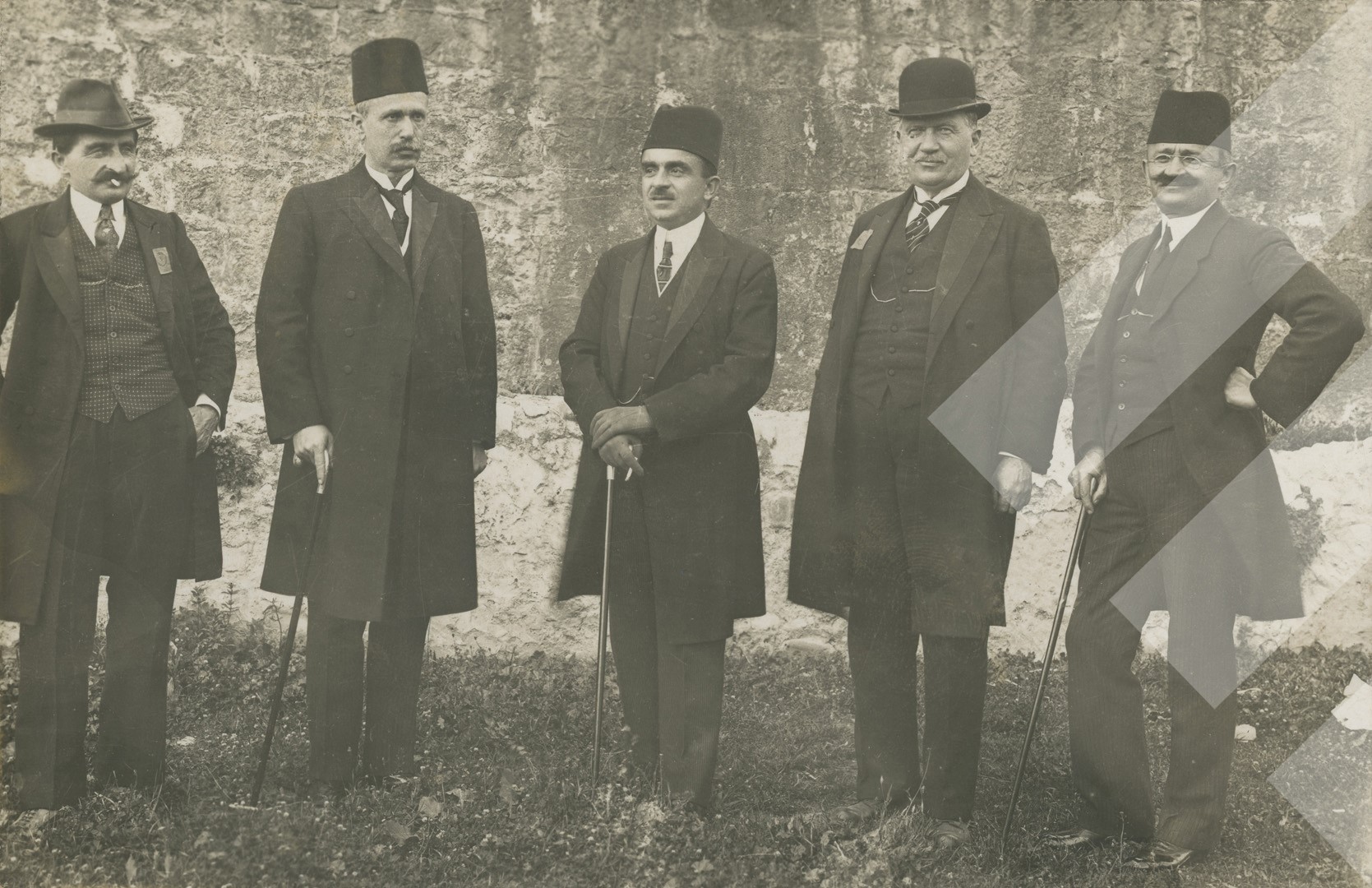 Kol Maca, Kabineti i formuar më 19 nëntor 1920 - 1 korrik 1921. Nga e majta Kristo Floqi, Selahudin Shkoza, Iljaz Vrioni, Tef Curani, Xhafer Ypi, print në letër, 9 x 14 cm.