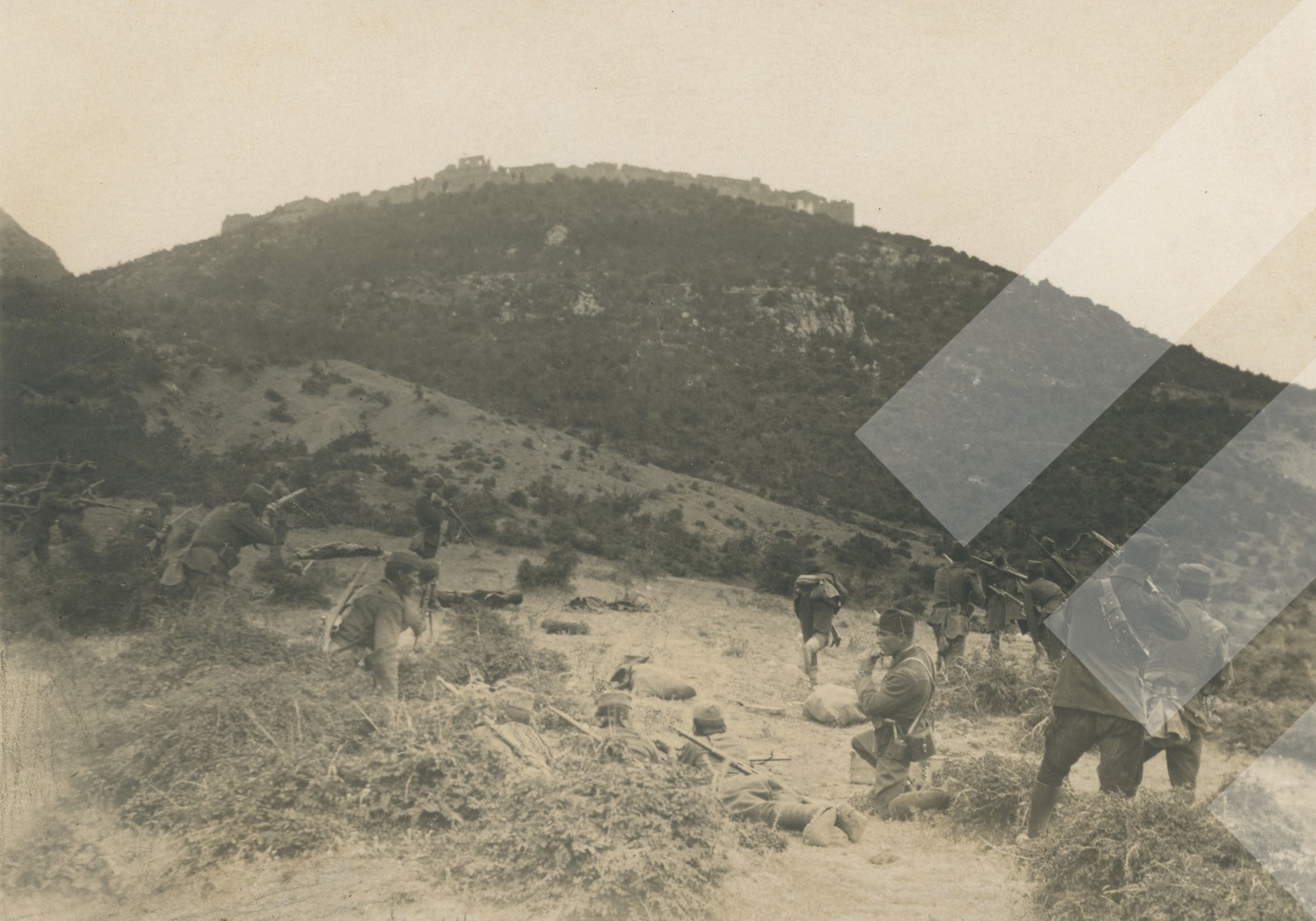 Kol Maca rreth 1921-1922 Forcat qeveritare në luftime me kryengritës në qytetin e Lezhës (fotot mund t'i përkasin rebelimit të Mirditës të nëntorit të vitit 1921) print në letër, 9 x 14 cm.