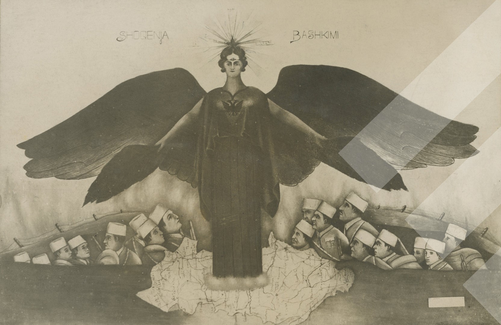 Kol Maca 1922 Figurë alegorike e shoqërisë "Bashkimi" print në letër, 9 x 14 cm.