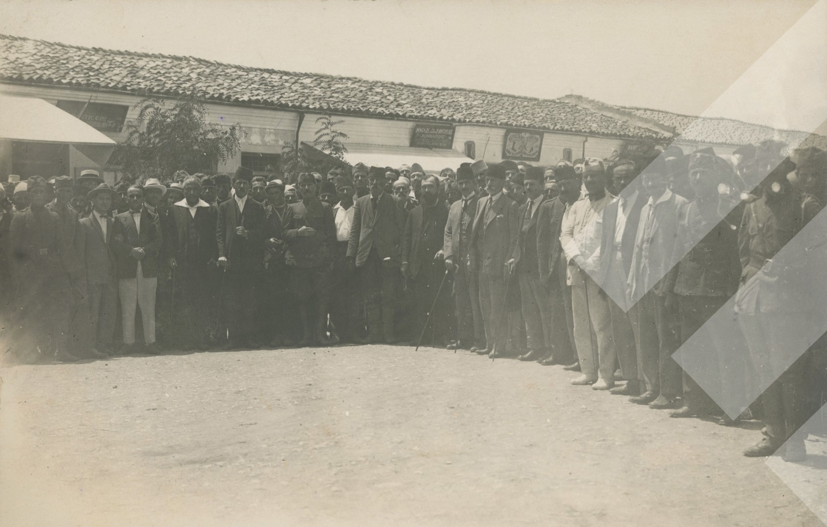 Kol Maca 1924 Kryeministri Fan Noli (në qendër) me një grup mbështetësish të qeverisë së tij. (Majtas tij, Hasan Prishtina) print në letër, 9 x 14 cm.