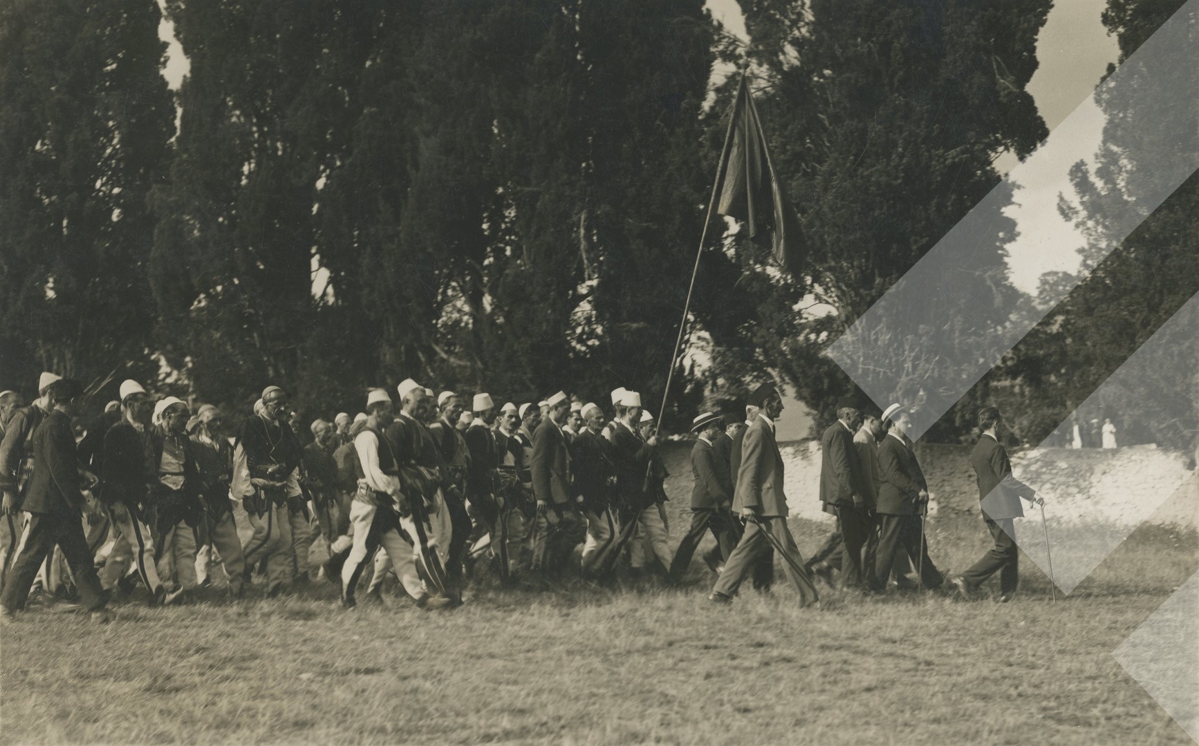 Kol Maca 1925 Paria dhe Bajraktarët e Malësive të mbledhur në Tiranë, përpara betimit ndaj Kryetarit të Republikës Ahmet Zogu print në letër, 9 x 14 cm.