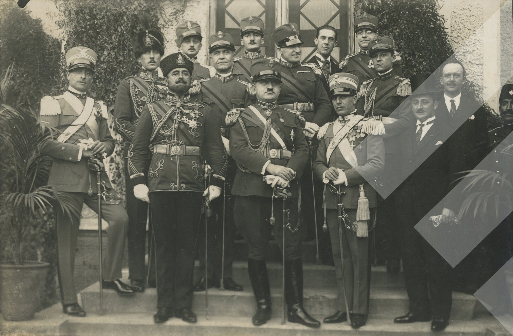 Kol Maca, 1926 Oficerët e mbrojtjes pozojnë në hyrje të pallatit mbretëror, print në letër, 9 x 14 cm.