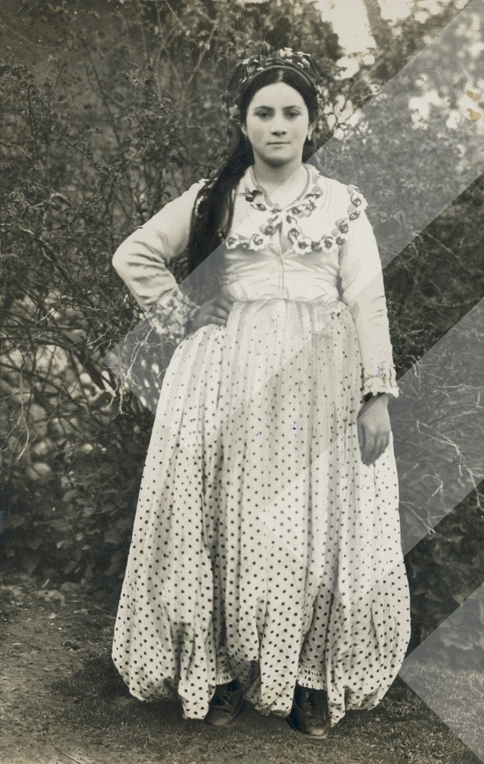 Kol Maca 1930 Grua me kostum tradicional tiranas print në letër, 9 x 14 cm.