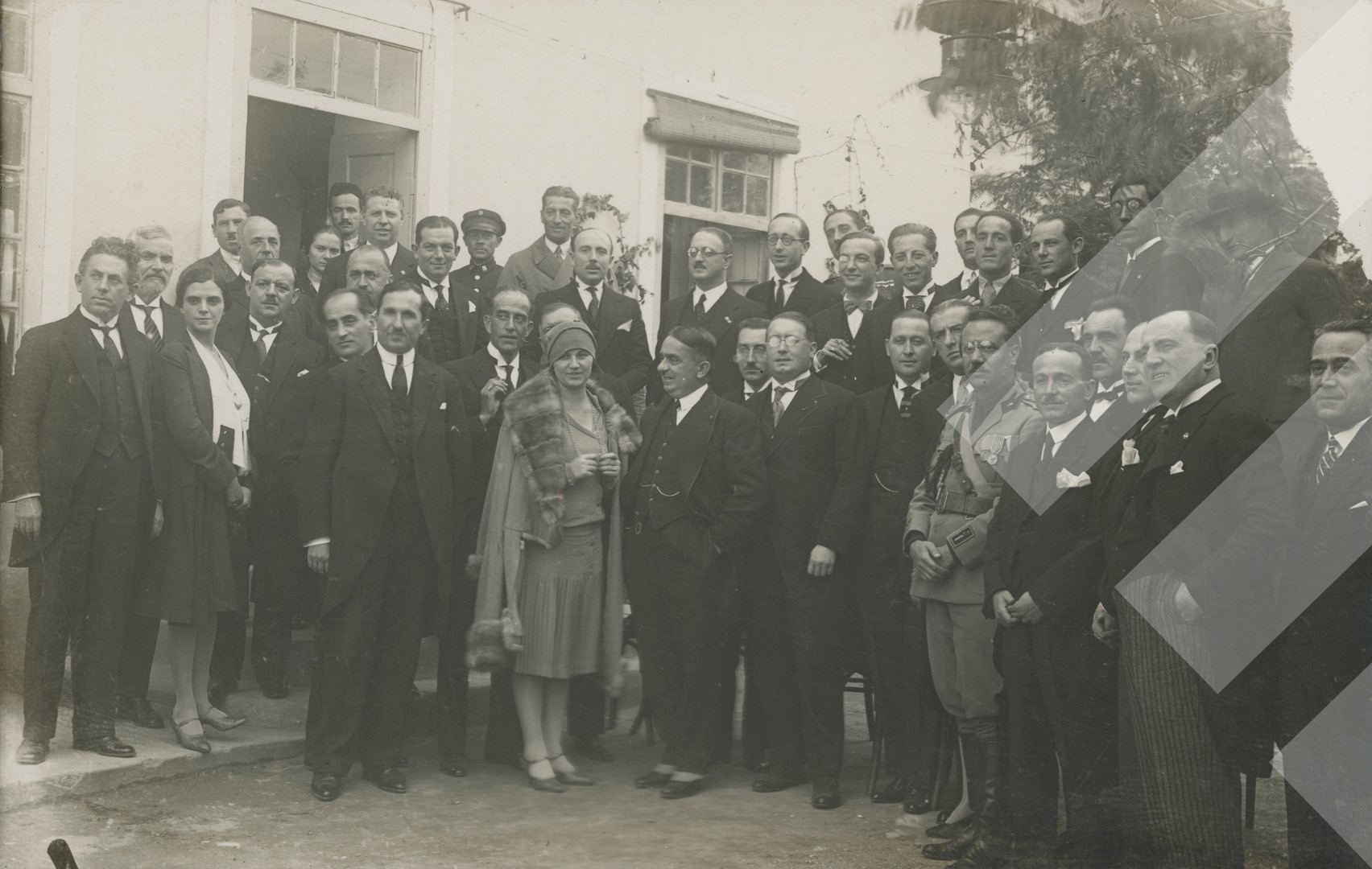 Kol Maca rreth 1925 Inagurimi i Bankës së Shqipërisë. Në qendër kryeministri Koço Kota, ministri i Jashtëm Iljaz Vrioni dhe Presidenti i Këshillit Drejtues të Bankës së Shqipërisë Mario Alberti print në letër, 9 x 14 cm.