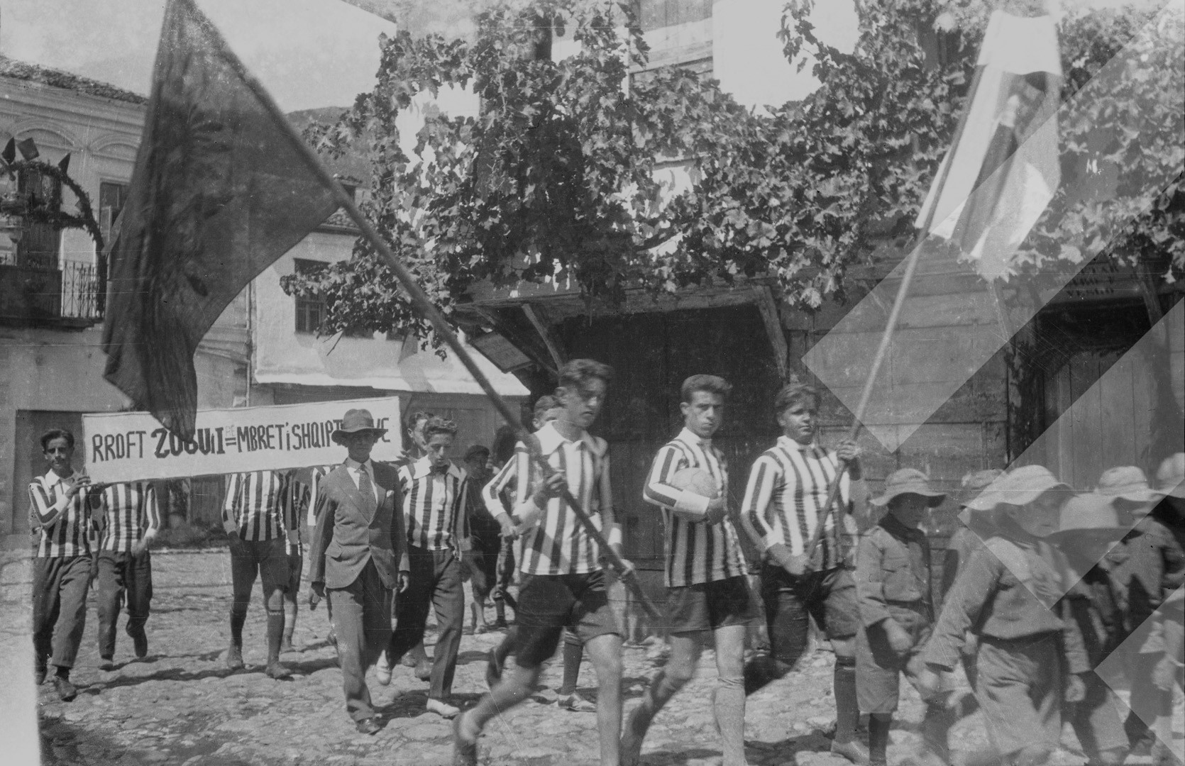 Kazazi A. Duhanxhiu, rreth 1935-1937, Bojskaut marshojnë në një rrugë të Elbasanit me pankartën "Rroftë Zogu I" negativ, 9 x 6 cm.
