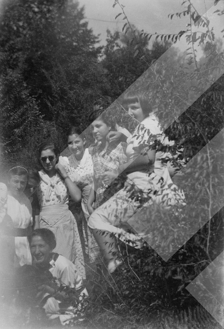 Kazazi A. Duhanxhiu, rreth 1935, Një grup vajzash në piknik, negativ, 9 x 6 cm.