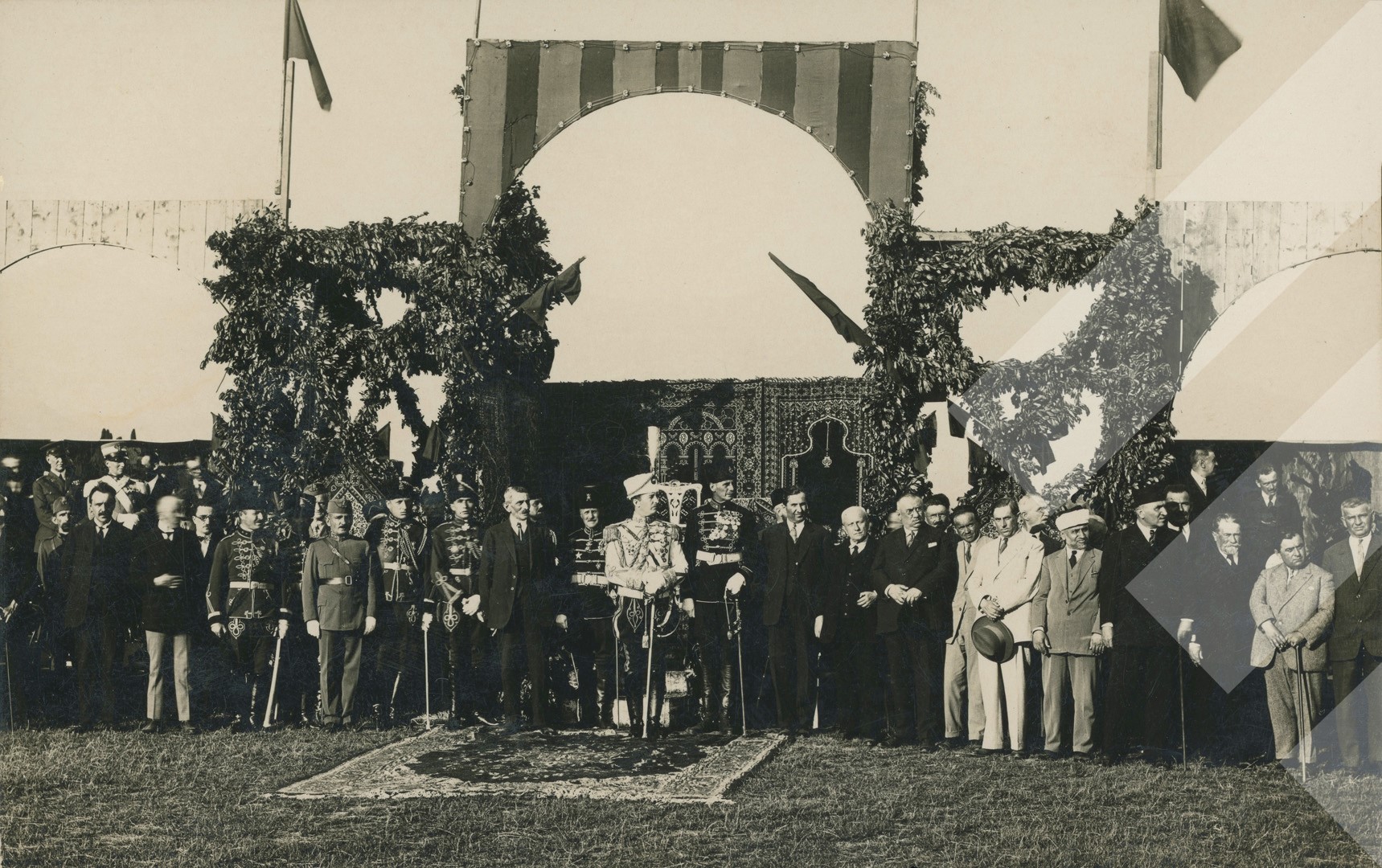 Ymer Bali, rreth 1925-1927, Presidenti i Republikës Ahmet Zogu dhe autoritete të tjera në një ceremoni zyrtare, në Sheshin e Shallvareve në Tiranë, print në letër, 9 x 14 cm.