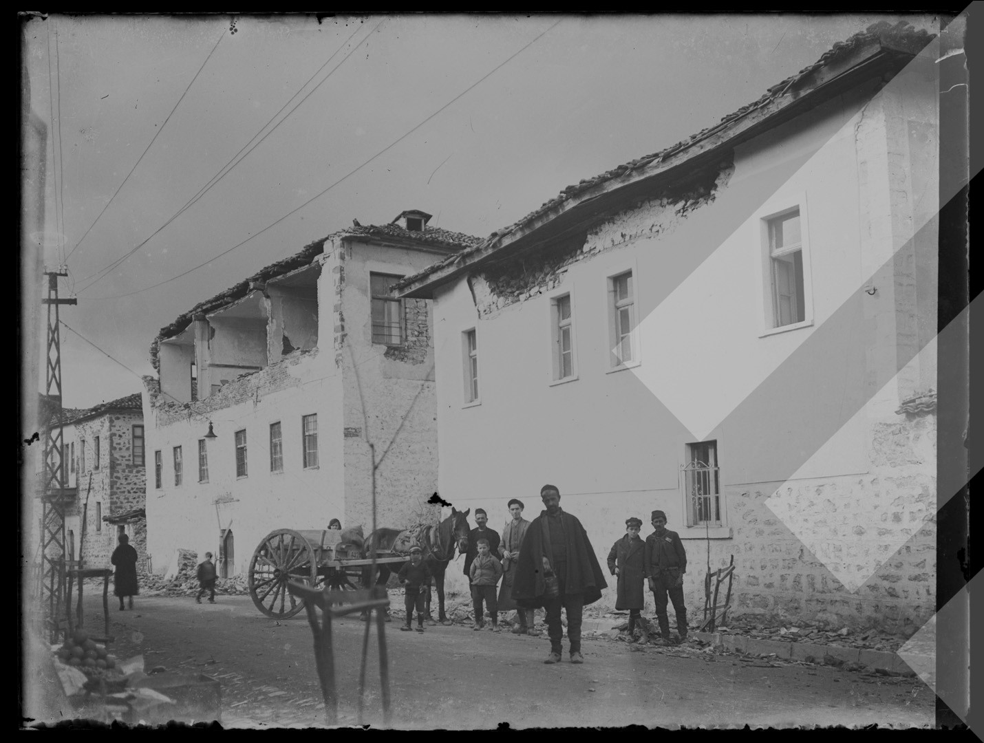 Hans Nechvatal, 1931, Shtëpi të dëmtuara nga tërmeti, Korçë, pllakë xhami, 9 x 12 cm.