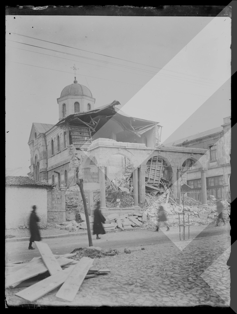 Hans Nechvatal, 1931, Kisha e Vllehëve (Shën Sotirit) pas tërmetit, Korçë, pllakë xhami, 9 x 12 cm.