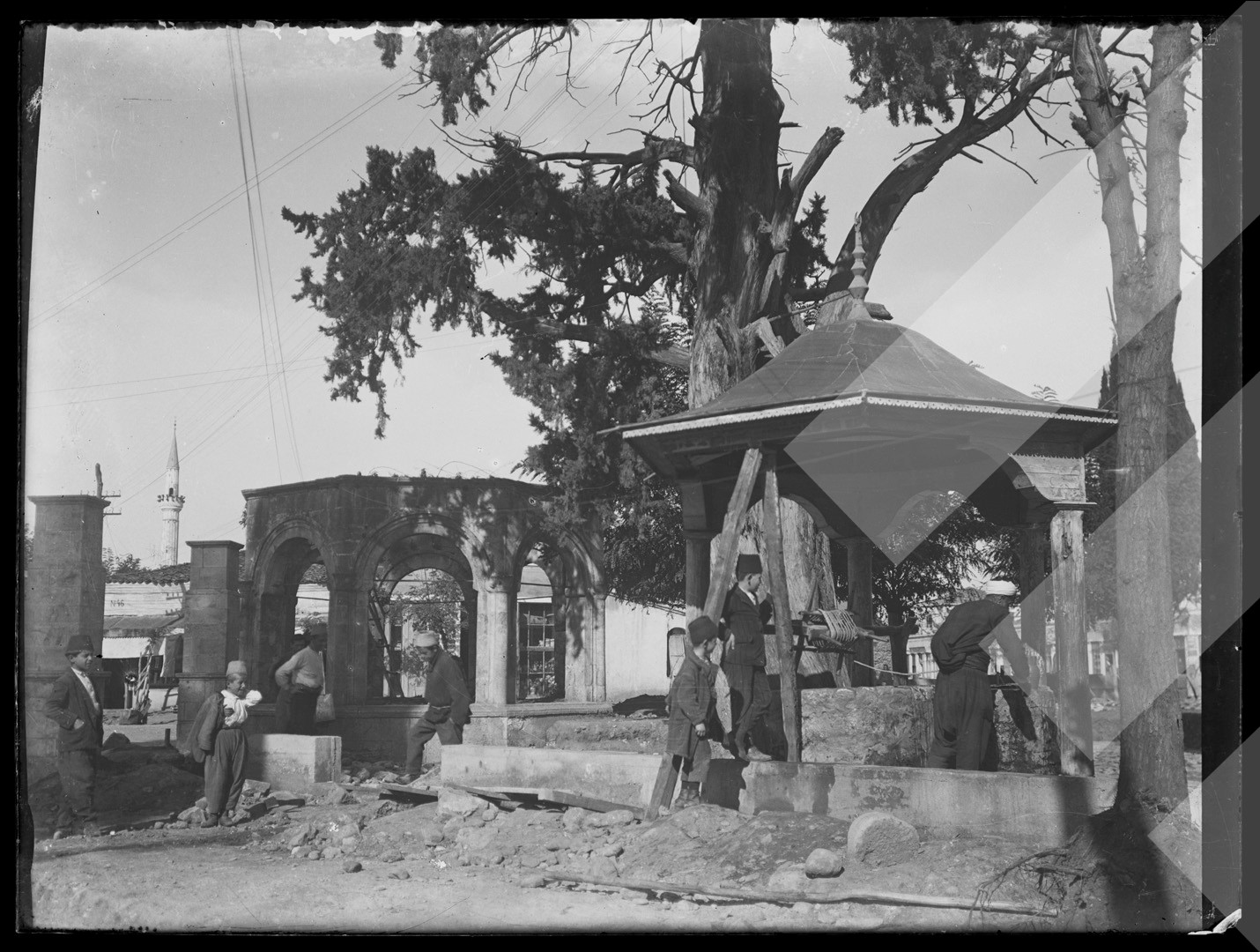 Hans Nechvatal, rreth 1930-1932, Varri monumental dhe pusi përpara xhamisë së vjetër në Tiranë, pllakë xhami, 9 x 12 cm.