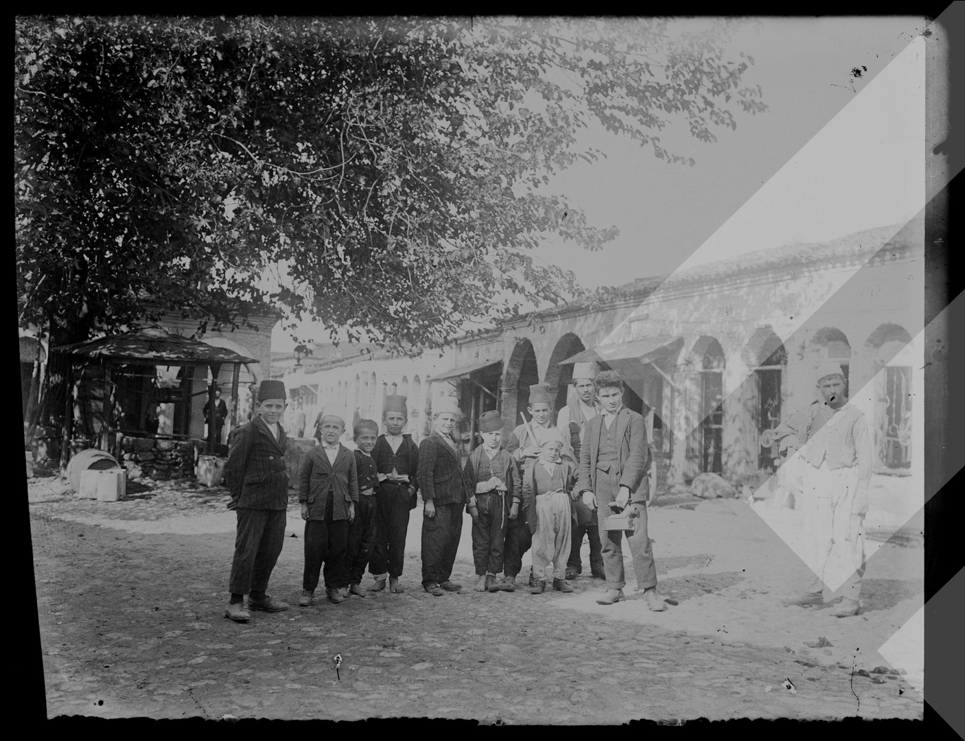 Hans Nechvatal, rreth 1930-1932, Çirak të vegjël në pazarin e Tiranës, pllakë xhami, 9 x 12 cm.