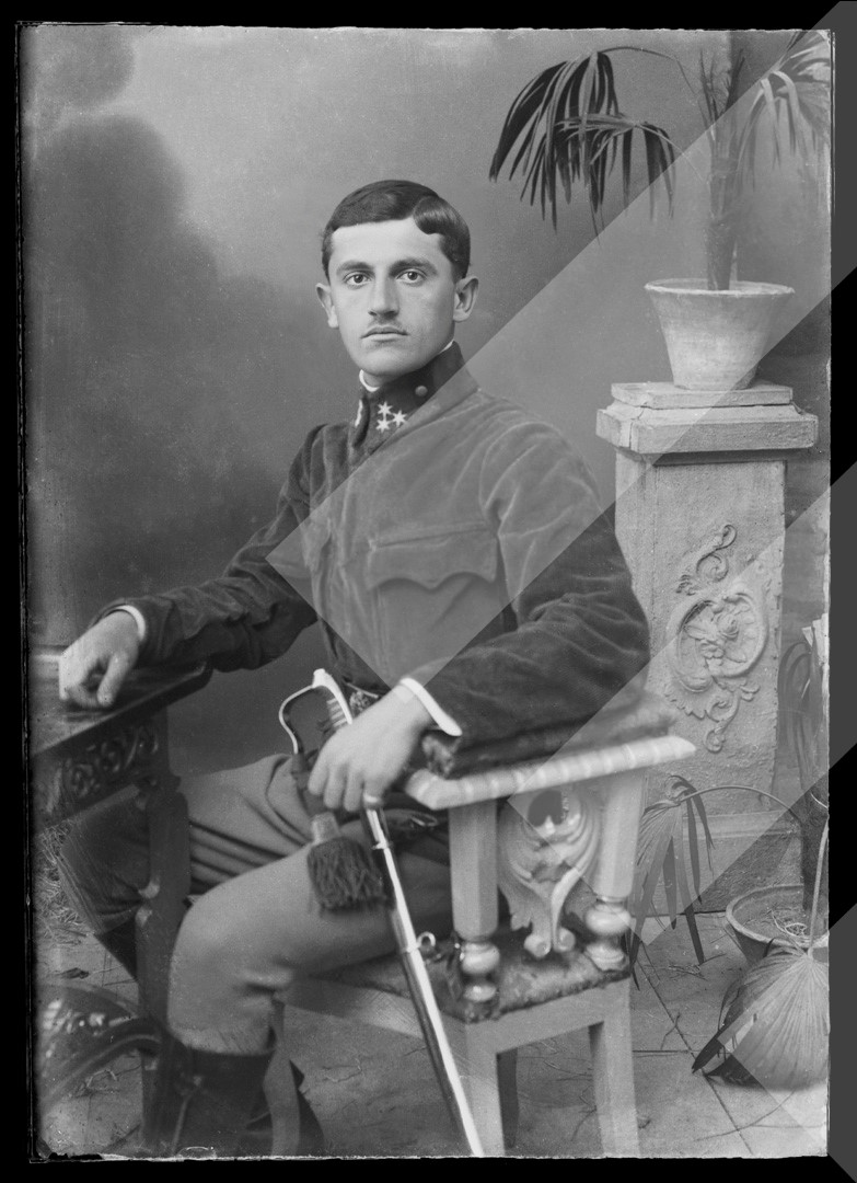 Kol Idromeno, rreth 1915-1918, I ri në uniformë, Shkodër, pllakë xhami, 6.5 x 9 cm.