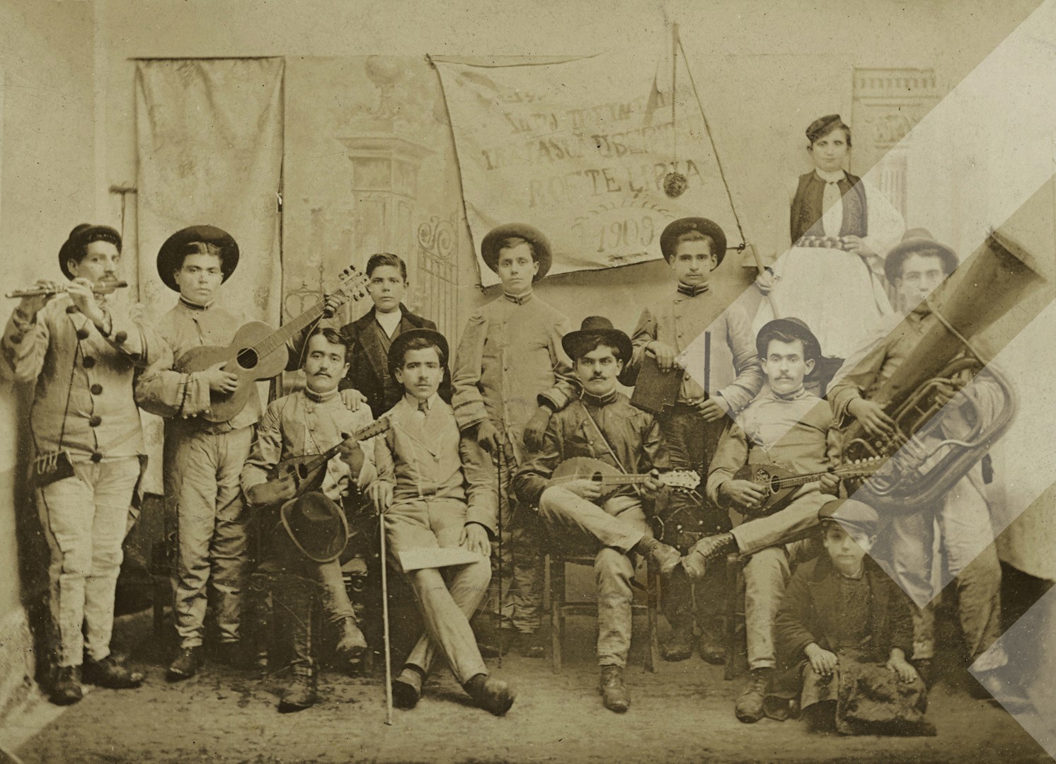 Kristo Sulidhi 1909 Bandë muzikore në qytetin e Korçës print në letër, 7.5 x 10 cm.