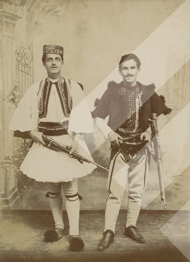 Kristo Sulidhi rreth 1905-1910 Dhimitër Emanuil Mborja dhe Jaup Bej Dishnica në pozë me armë print në letër, 12 x 16 cm.