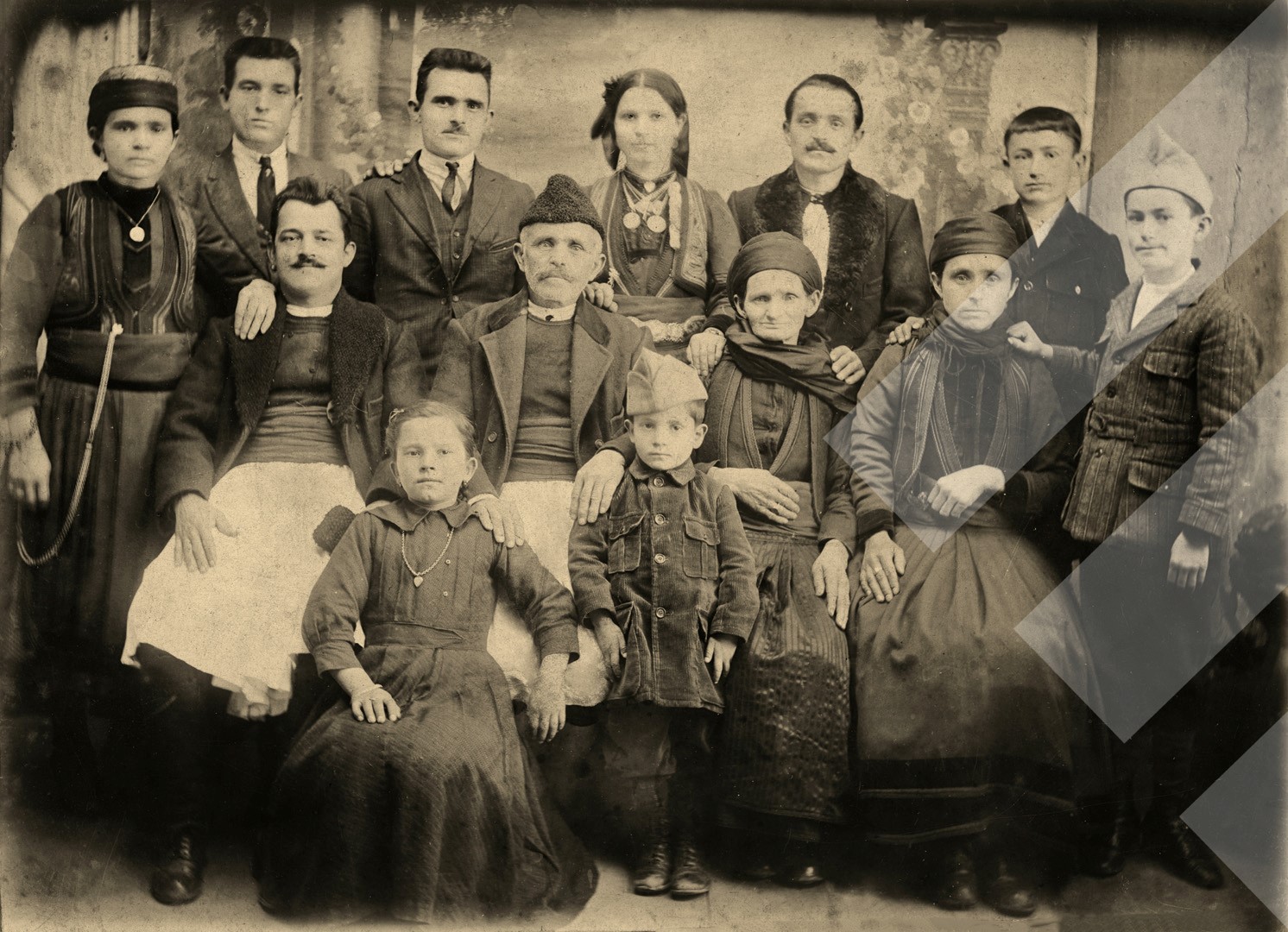 Kristo Sulidhi rreth 1895-1900 Familje në studio print në letër, 13 x 18 cm.