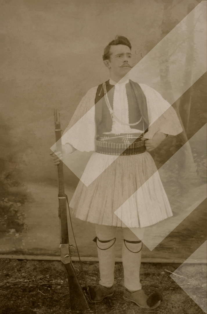 Dhimitër Vangjeli, rreth 1910 - 1914, Burrë i armatosur në pozë, print në letër, 11 x 16 cm.