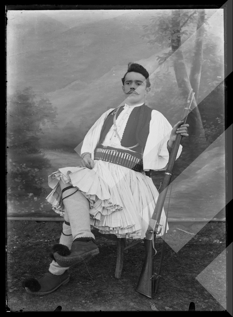 Dhimitër Vangjeli 1918-1920 shqipëtar me veshjen tradicionale të Jugut pllakë xhami, 13 x 18 cm.