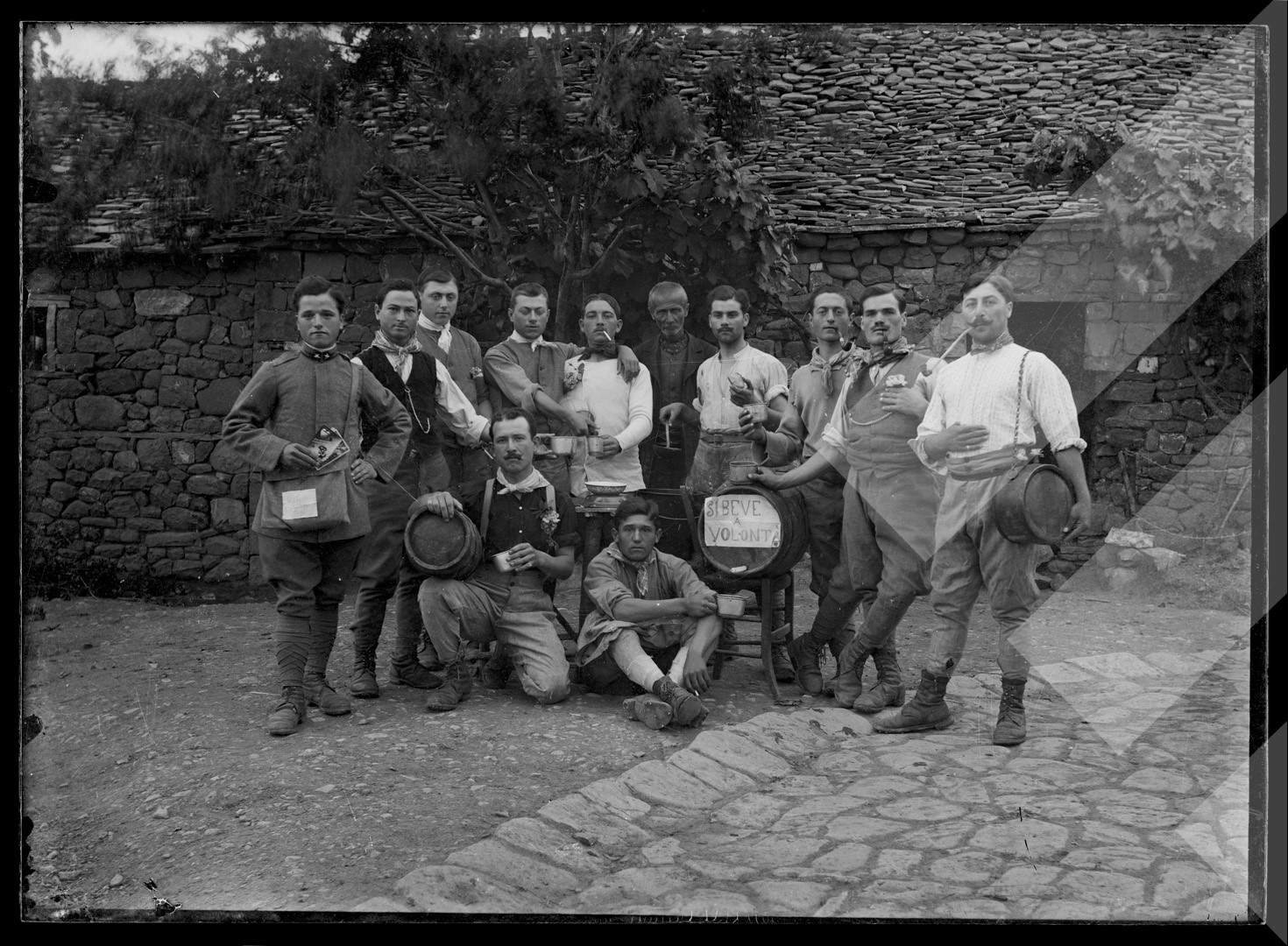 Dhimitër Vangjeli, 1916-1917 Grup ushtarësh dhe oficerësh italianë të Luftës I Botërore në kohën e lirë, duke pozuar me gota, garuzhde dhe bute vere në duar. Mbi but shkruhet:"Pini sa të doni" pllakë xhami, 13 x 18 cm.