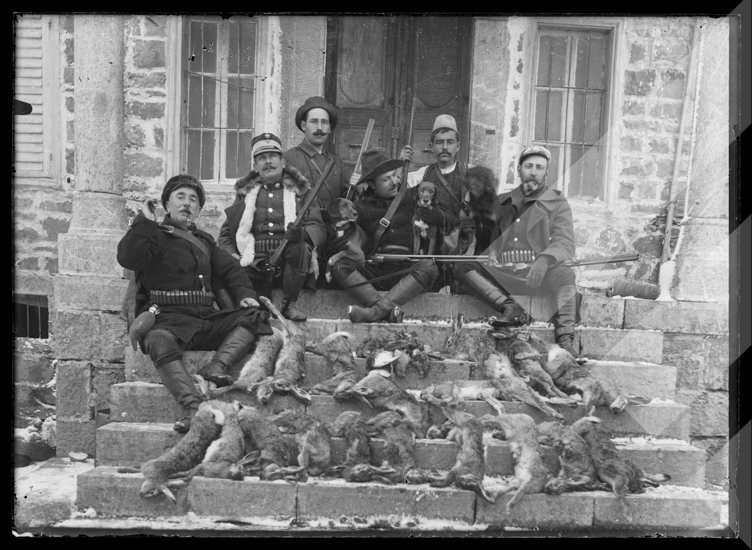 Dhimitër Vangjeli 1913-1914 oficerë grekë dhe shoqërues shqiptarë, dalë me trofetë e gjahut pllakë xhami, 13 x 18 cm.