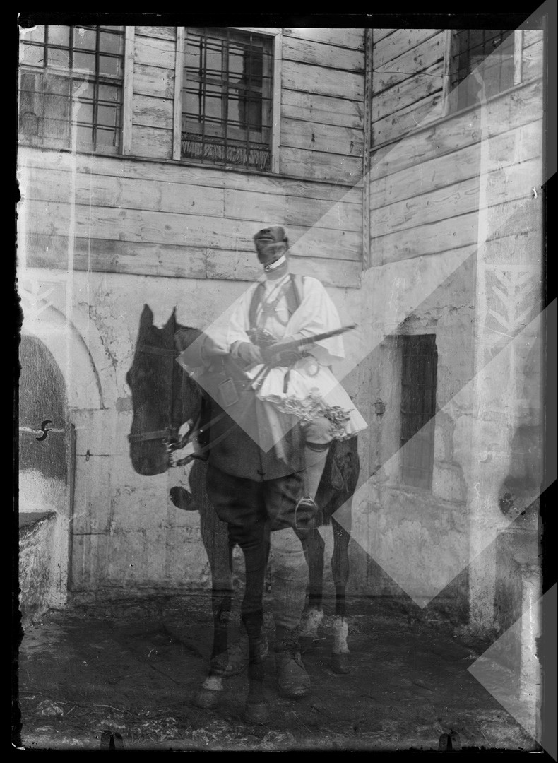 Dhimitër Vangjeli 1912-1915 burrë nga Jugu, dalë mbi kalë.(Pllaka e xhamit është ripërdorur nga fotografi, ndaj dallohet mbivendosja e imazheve) pllakë xhami, 13 x 18 cm.