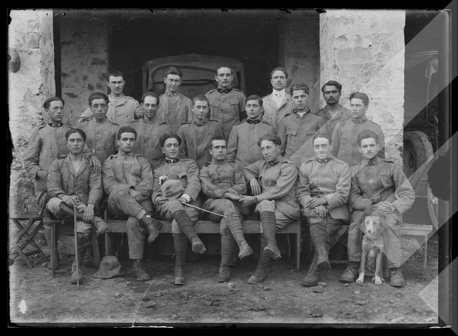 Dhimitër Vangjeli , "", 1916-1918 , , togë e ushtarëve italianë të Luftës I Botërore, duke pozuar përpara garazhit të automjeteve ushtarake, , pllakë xhami , 13 x 18 cm