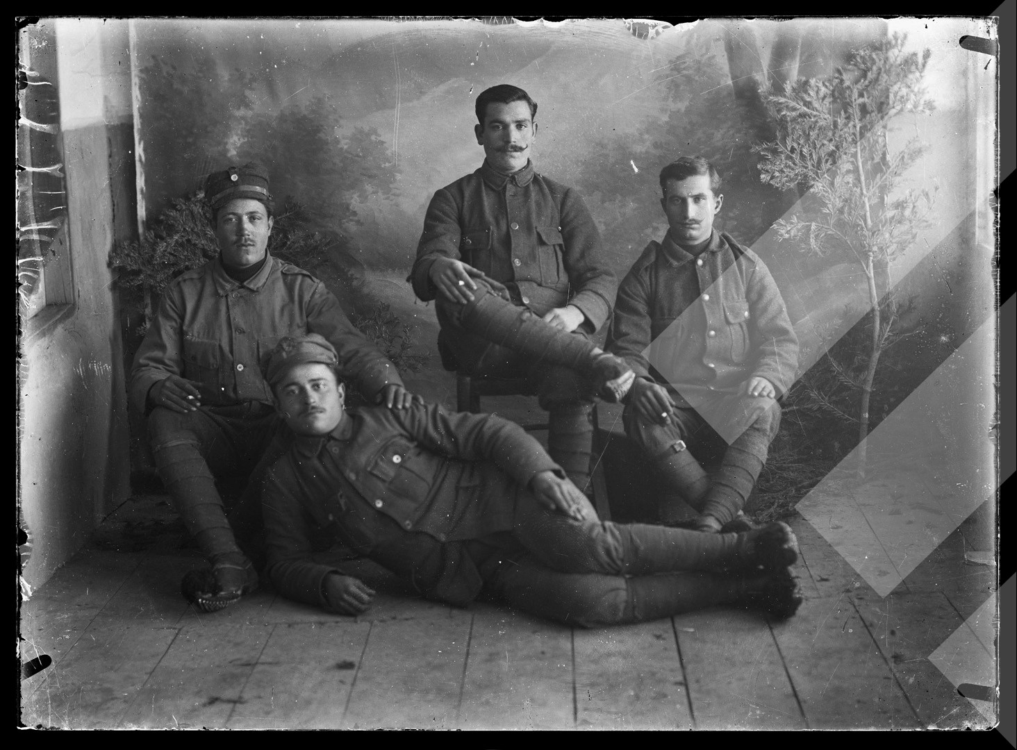 Dhimitër Vangjeli , "", 1913-1914 , , një grup ushtarësh grekë të Luftës I Botërore, duke pozuar në studio, , pllakë xhami , 12 x 16 cm