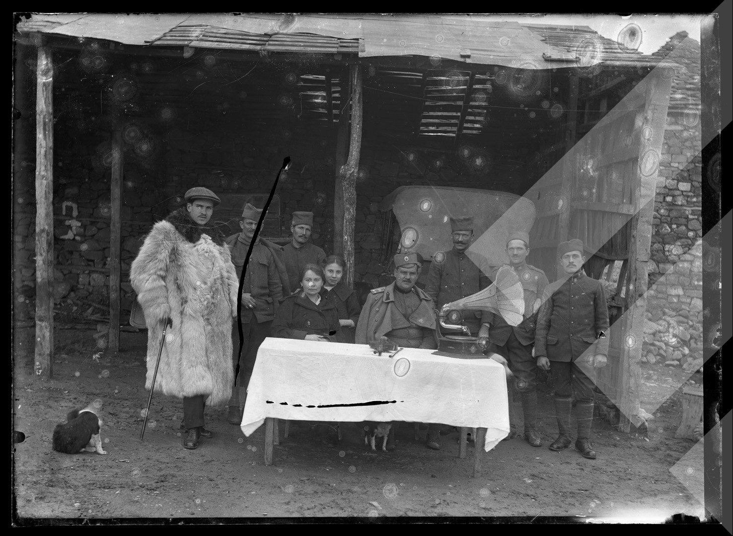 Dhimitër Vangjeli , "", 1915-1918 , , (Një oficer serb pozon me një gramafon, rrethuar nga ushtarët e tij), , pllakë xhami , 13 x 18 cm