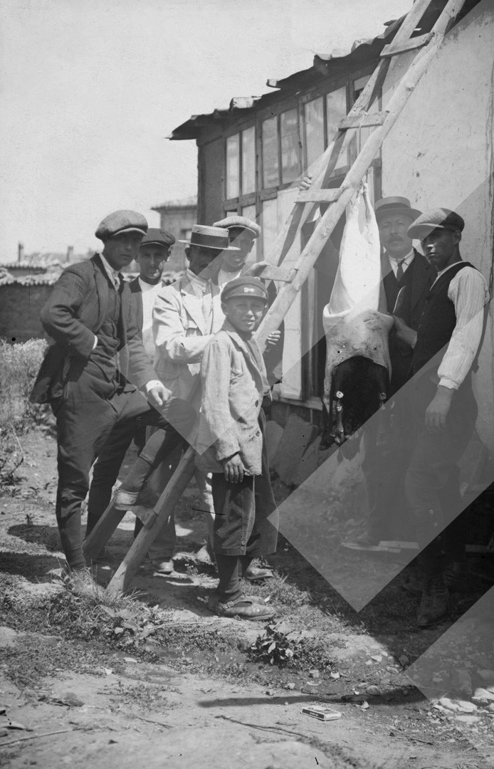 Vani Burda, rreth 1935-1940, Në përgatitje të qengjit të Pashkës (në qendër fotografi Vani Burda), negativ në letër,, 9 x 14 cm.