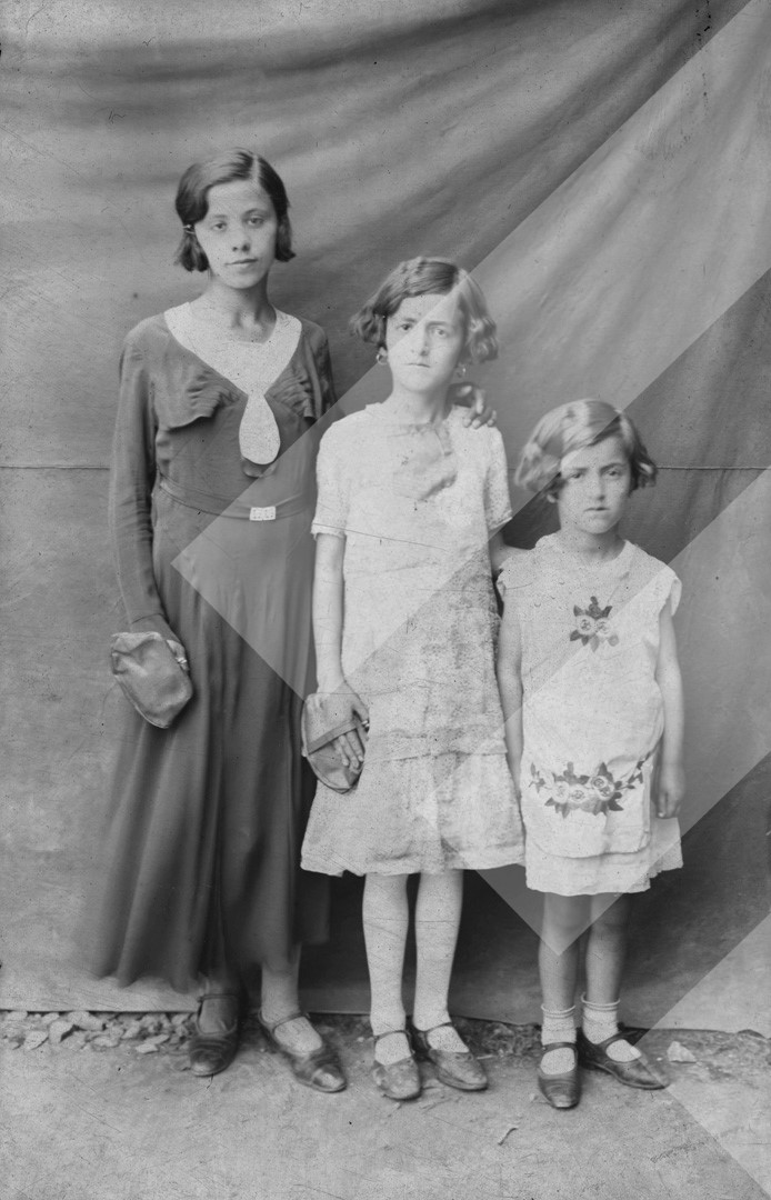 Vani Burda, rreth 1935-1940, Tri motra në pozë, negativ në letër, 9 x 14 cm.